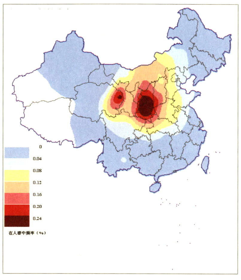 师姓在人群中分布频率示意图(见图2)表明:在陕宁晋豫、内蒙古中部、甘肃大部、青海东部、川渝北部、湖北大部、安徽北部、山东西部、河北大部、北京西部,师姓占当地人口的比例一般在0.08%以上,最高可达o.4%以上,以上地区覆盖面积约占国土总面积的20.6%,居住了大约64%的师姓人群。在辽宁西端、河北东北、北京东部、天津、山东中部、江苏北部、安徽中部、湖北东部、赣湘黔北段、重庆南部、四川中部,师姓占当地人口的比例一般在0.04%一0.08%之间,以上地区覆盖面积约占国土总面积的9.9%,居住了大约19%的师姓人群。